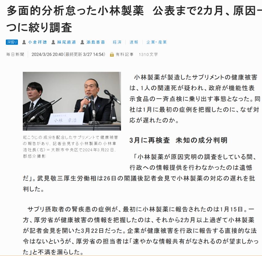 自3月28日,有日本消費者在服用了小林製藥的紅曲保健品,因腎臟問題不治身亡後,有關小林製藥的負面輿情就在持續不斷髮酵。