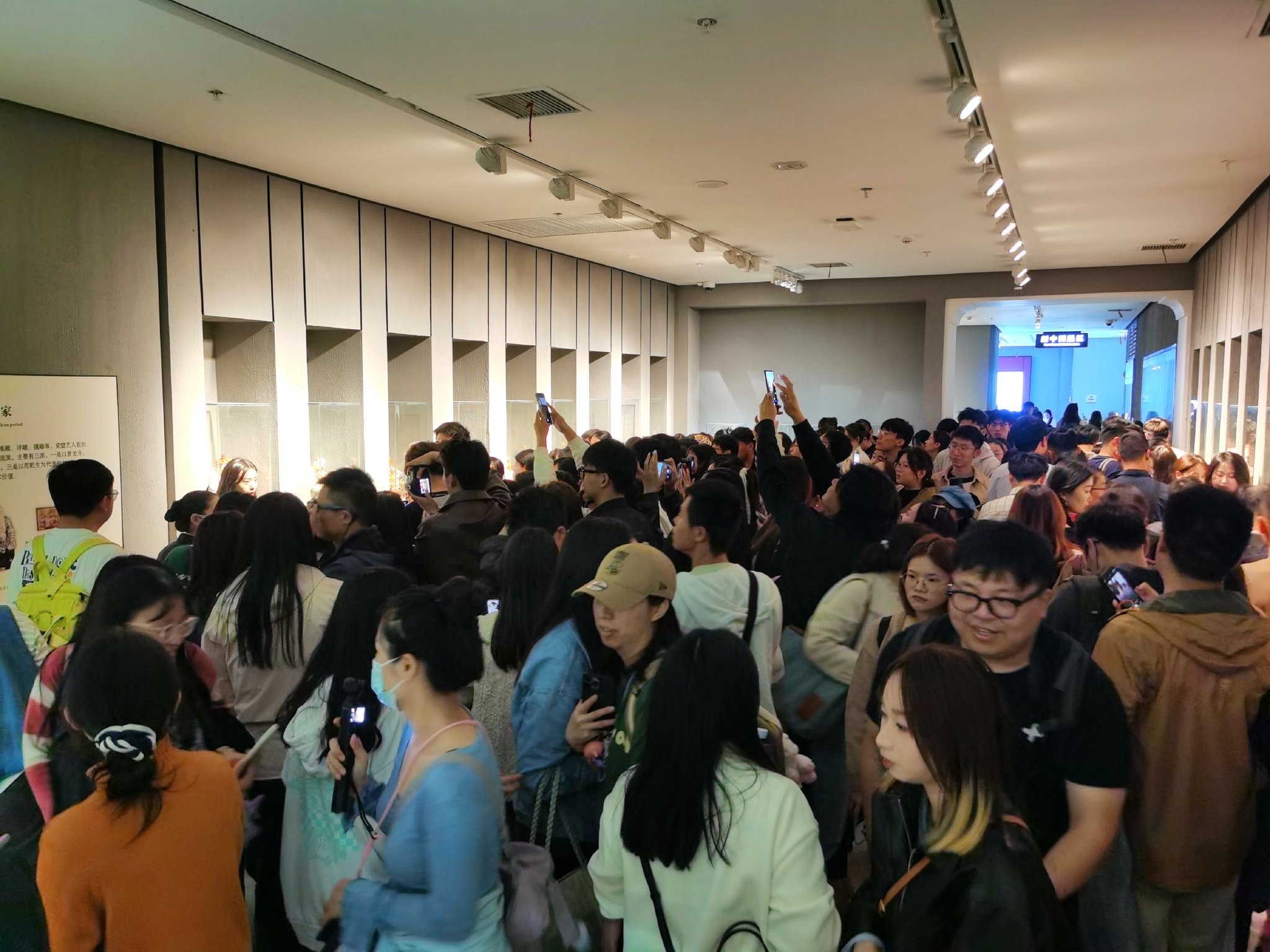 張女士提供的照片顯示,4月5日位於景德鎮的中國陶瓷博物館人流密集,在網紅展品“無語羅漢”陶瓷雕塑前拍照“打卡”的遊客摩肩接踵。