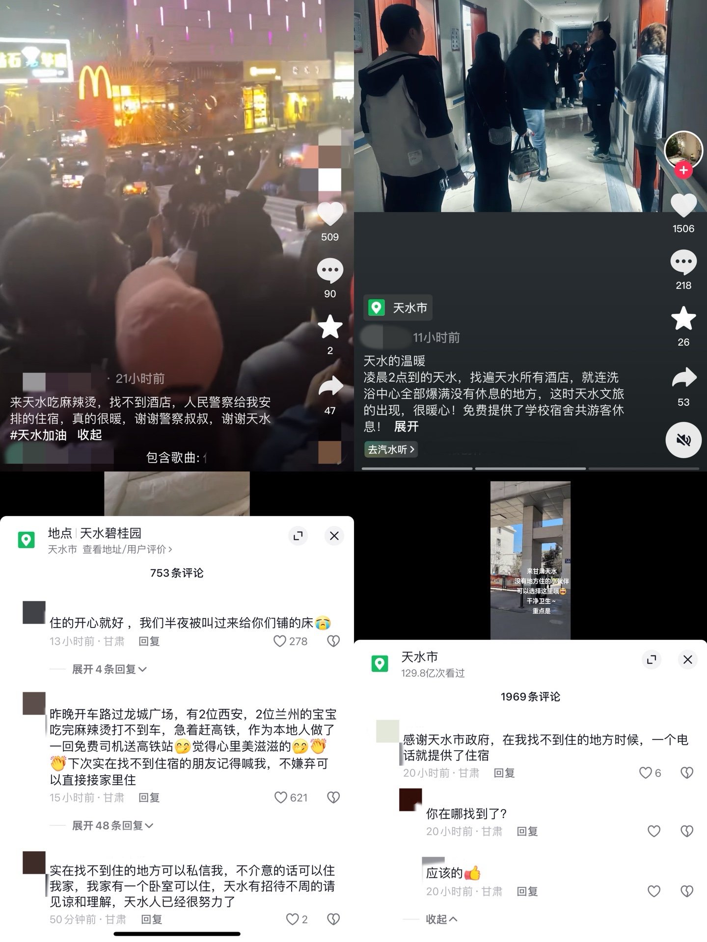 在社交平台上,不少網友發佈了找不到住宿而被幫助的內容,紛紛表示“感謝天水”。