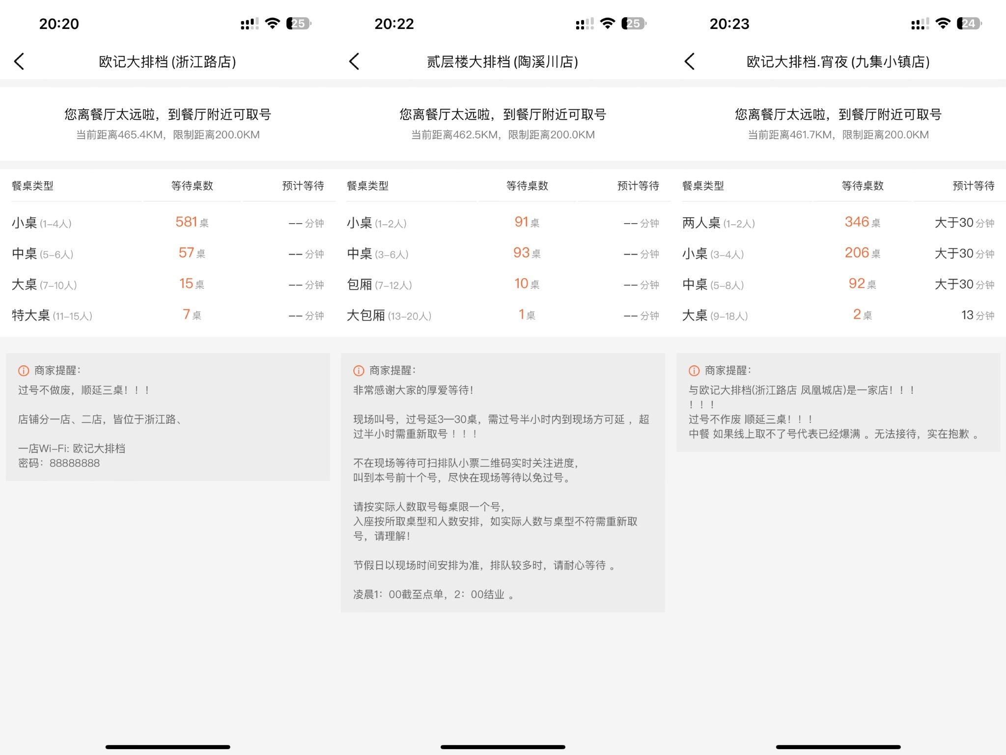 4月4日晚,澎湃新聞在大眾點評上搜索發現,景德鎮多家餐廳爆滿。如截至當日20:20,歐記大排檔浙江路店的小桌需等待581桌,中桌需等待57桌。截至當日20:22,貳層樓大排檔陶溪川店的小桌需等待91桌,中桌需等待93桌。截至當日20:23,歐記大排檔九集小鎮店的兩人桌需等待346桌,小桌需等待206桌,中桌需等待92桌。