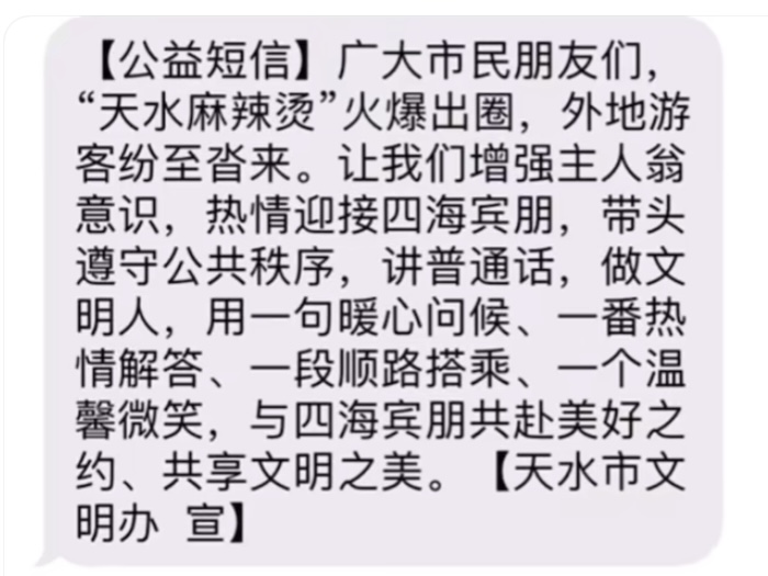 事實上,自3月以來天水在網絡“出圈”後,遊客就絡繹不絕。有多位當地網友“曬”的消息顯示,3月20日收到天水市發佈的“公益短信”,建議當地市民“增強主人翁意識,熱情迎接四海賓朋……用一句暖心問候、一番熱情解答、一段順路搭乘、一個温馨微笑,與四海賓朋共赴美好之約……”