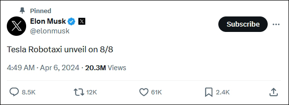 此後,馬斯克發佈並置頂了另一則帖文:“特斯拉Robotaxi將於8月8日揭幕。”這帶動特斯拉股價在盤後交易中回升。