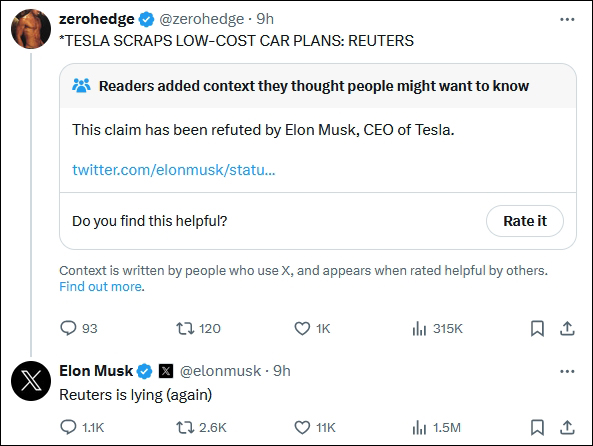 路透社4月5日發佈獨家報道稱,面臨來自中國電動汽車企業的“激烈競爭”,特斯拉已經放棄推出被寄予厚望將刺激銷量的低成本入門級車型Model 2,致其股價大幅跳水。特斯拉CEO埃隆·馬斯克隨後在社交媒體X(原推特)否認該報道稱:“路透社又在撒謊。”