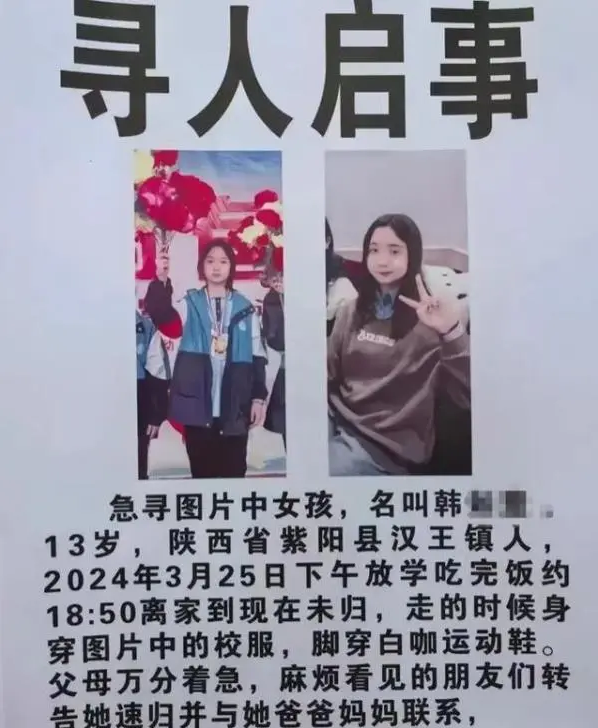 3月25日,陝西安康紫陽縣一名13歲女孩韓某某失蹤。其家長髮布尋人啓事稱:韓某某於2024年3月25日下午放學吃完飯,約18:50離家未歸,走時身穿校服,腳穿白咖運動鞋。