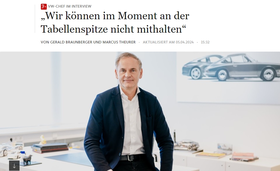 (觀察者網訊)當地時間5日,德國《法蘭克福匯報》網站刊登了對大眾汽車集團首席執行官奧利弗·布魯姆(Oliver Blume)的專訪。談及大眾旗下電動汽車在中國面臨挑戰時,布魯姆的回答被文章用作了標題——“我們目前無法保持領先地位”。