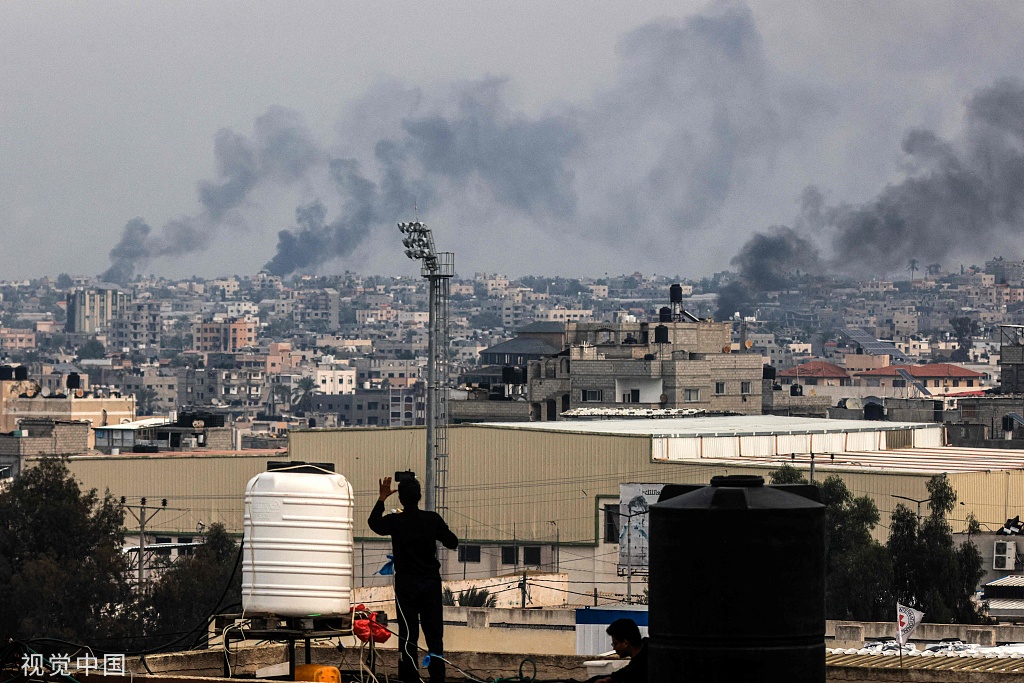 當地時間2023年12月17日,加沙地帶汗尤尼斯遭以色列轟炸,一名男子在屋頂上拍攝煙霧滾滾的照片。(圖源:視覺中國)