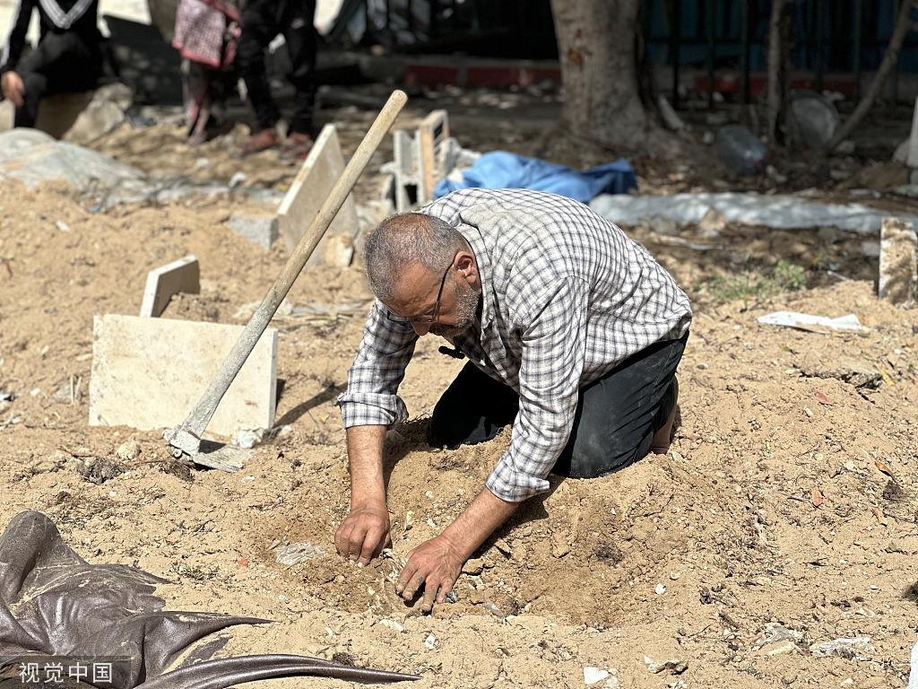 當地時間2024年4月5日,加沙地帶加沙城,一位巴勒斯坦父親試圖尋找在以色列襲擊中喪生的小女兒的墳墓。由於襲擊,大多數墓地都變成了一堆瓦礫。(圖源:視覺中國)