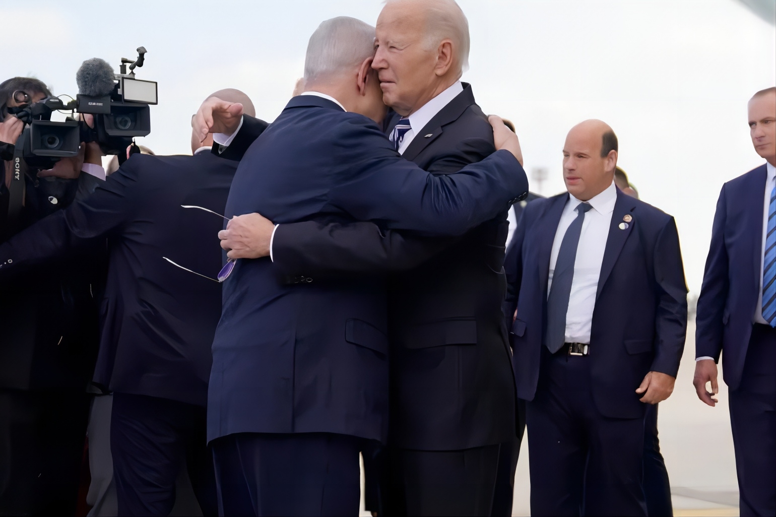 10月7日哈馬斯突襲後,拜登立刻“無條件支持”以色列,並突訪特拉維夫,在機場擁抱內塔尼亞胡。拜登的力挺以色列政策被認為是“熊抱”政策,意圖用強大甚至窒息性的擁抱迫使內塔尼亞胡按照美國的意圖行事。