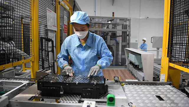 2022年4月7日,越南工人在組裝電動汽車。圖源:視覺中國