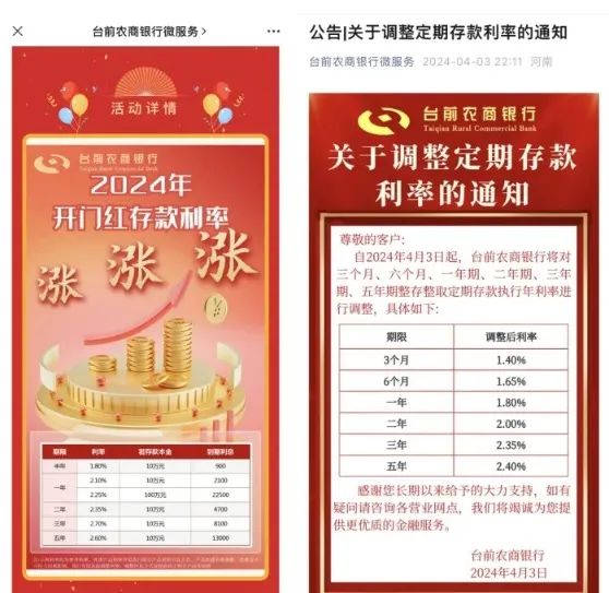 這並非個例,台前農商銀行也從4月3日起調整定存利率。調整前,該行三年期定存利率高於五年期定存利率10個基點,分別為2.70%和2.60%。調整後,三年期定存利率則低於五年期定存利率5個基點,分別為2.35%和2.40%。