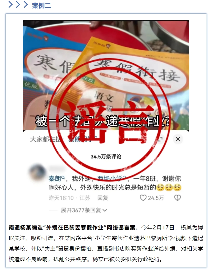 江蘇公安介紹南通楊某編造“外甥在巴黎丟寒假作業”網絡謠言案:今年2月17日,楊某為博取關注、吸粉引流,在某網絡平台“小學生寒假作業遺落巴黎廁所”短視頻下造謠某學校,並以“失主”舅舅身份擺拍、直播到書店購買新作業送給外甥,對相關學校造成不良影響,擾亂公共秩序。楊某已被公安機關行政處罰。