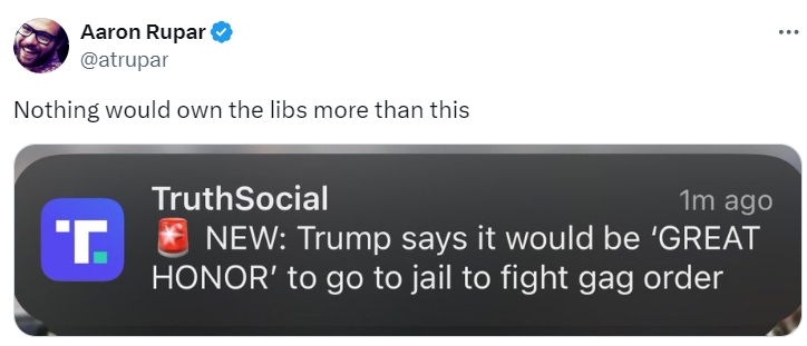 記者阿龍·魯帕爾(Aaron Rupar)轉發一則“特朗普稱為了抗議禁言令而進監獄是莫大的榮幸”的通知截圖,並嘲諷道:“沒有什麼比這更享有自由主義了。”