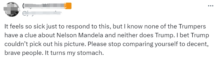 有人嘲諷估計特朗普根本不瞭解曼德拉,連曼德拉長什麼樣都不知道,“我打賭特朗普連他(曼德拉)的照片都挑不出來。請不要把自己和正派勇敢的人相提並論。讓我反胃。”
