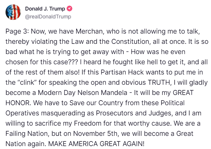 眼看開庭日期一天天臨近,身背四項刑事訴訟的特朗普4月6日發佈長文,挨個抨擊自己所涉案件的主審法官,其中就包括主審“封口費”案的梅爾尚,稱對方不允許自己説話的禁令違反了法律和憲法。