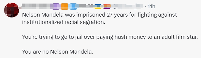 此番言論在社交媒體遭到羣嘲。有美國網民鼓勵他用入獄來致敬曼德拉27年的服刑經歷,有人批其拿豔星“封口費”案蹭南非前總統是越級碰瓷、恬不知恥。