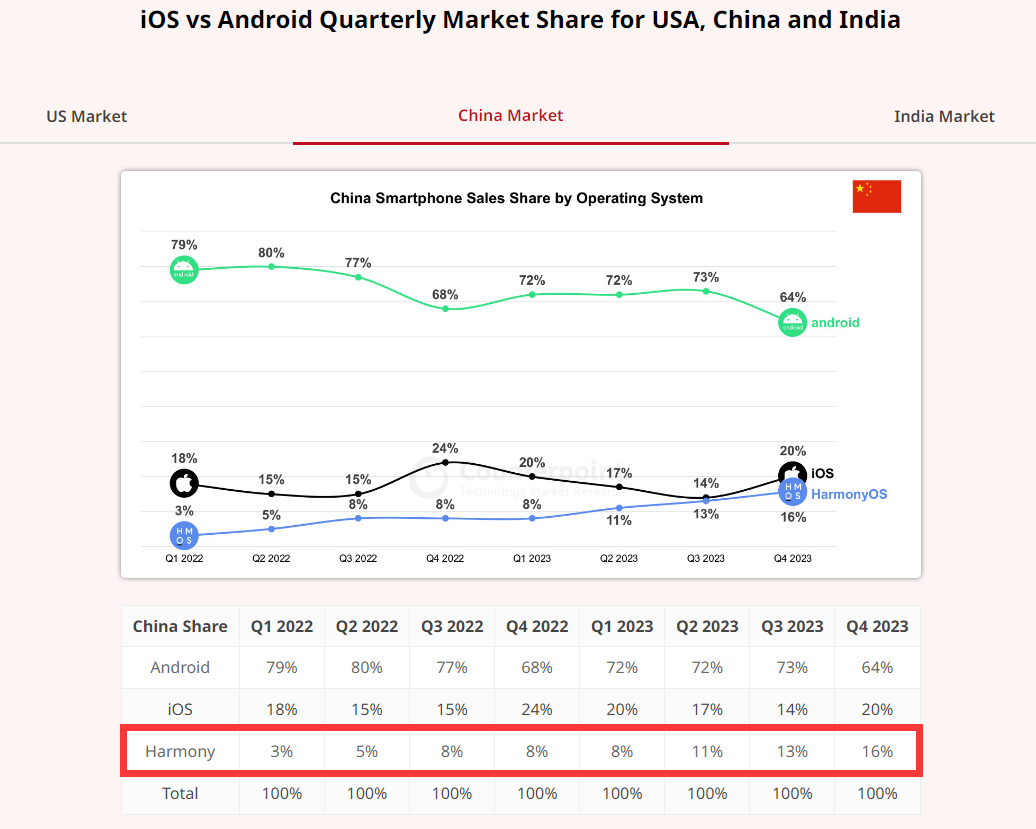 根據近期Counterpoint Research發佈的數據,2023年四季度,鴻蒙OS在中國智能手機市場的份額突破了16%,相比兩年前增長了13個百分點,與蘋果iOS的差距縮小至4個百分點;該季度,超過40%的鴻蒙手機支持5G,而上年同期為7%。而在全球市場上,鴻蒙4%的份額,與兩大傳統巨頭仍存在明顯差距,蘋果iOS的份額為 23%,安卓則為74%。