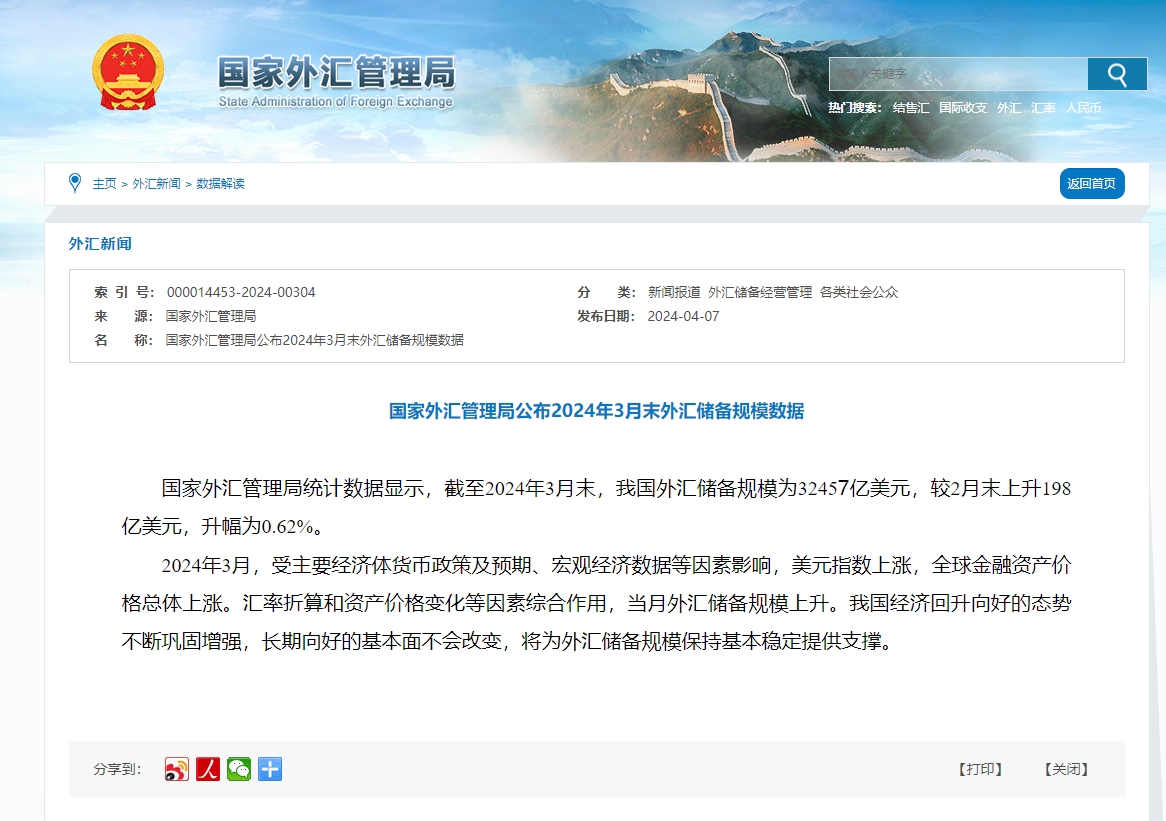 另據國家外匯管理局網站4月7日公佈的2024年3月末外匯儲備規模數據,截至2024年3月末,我國外匯儲備規模為32457億美元,較2月末上升198億美元,升幅為0.62%。