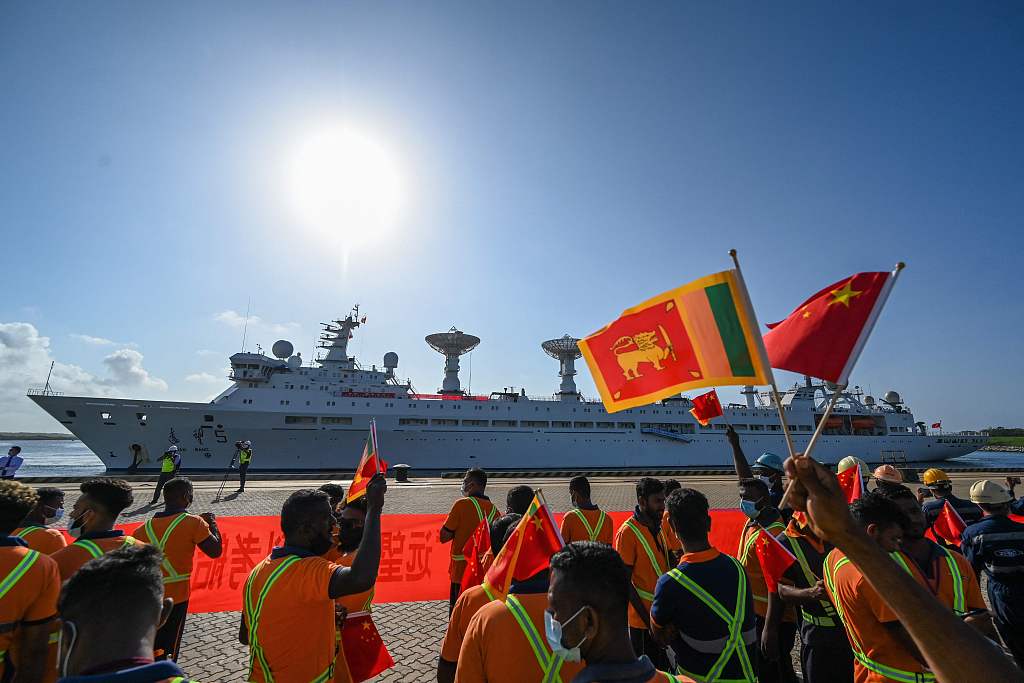 當地時間2022年8月16日,斯里蘭卡漢班託塔港,中國科考船“遠望5號”抵達當地,工人們揮舞着中國和斯里蘭卡國旗。(圖源:視覺中國)