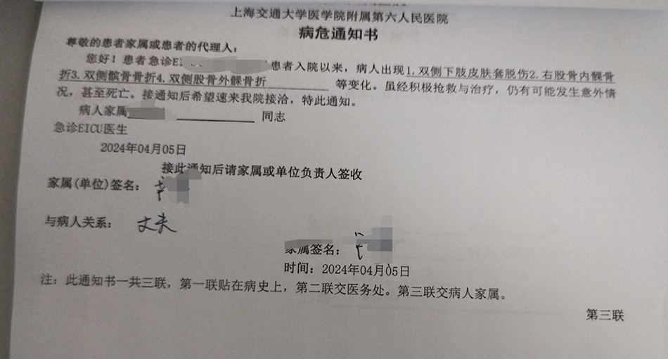 4月5日,醫院下達病危通知書,表明患者出現雙側下肢皮膚套脱傷、右股骨內髁骨折、雙側髕骨骨折、雙側股骨外髁骨折等情況。雖經積極搶救與治療,仍有可能發生意外情況,甚至死亡。