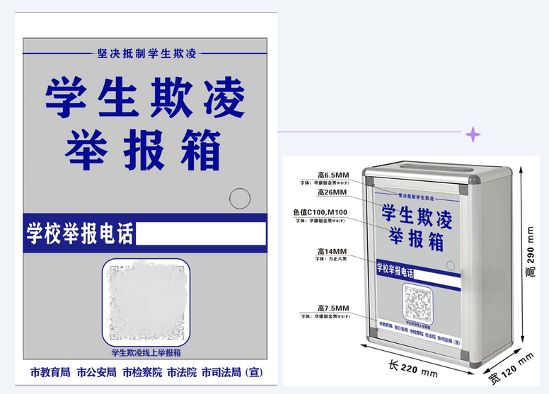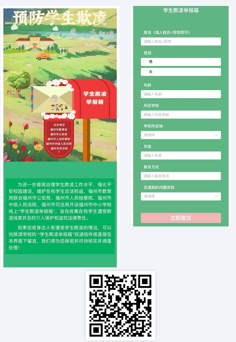 通知要求,各地各校要通過“線上+線下”雙渠道收集學生欺凌線索並及時介入保護、調解和追究法律責任,保護福州市中小學生安全。同步設置“線上+線下”舉報信箱,線下舉報信箱統一名為“學生欺凌舉報箱”,並統一舉報箱的標識、尺寸、規格、字體高度、字體大小和顏色等。線上“學生欺凌舉報箱”由市教育局牽頭搭建,並在線下舉報箱明顯處展示線上“學生欺凌舉報箱”二維碼鏈接入口,通過掃描二維碼進入後填寫相關信息即可完成舉報。