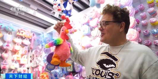 不光是體育用品,法國元素的紀念品、工藝品也紛紛大賣,一家店鋪的經典款埃菲爾鐵塔,已連續補了好幾次貨。而不少帶有法國元素的電子產品也備受青睞,在一家玩具店鋪,荷蘭採購商羅馬諾被一隻電子公雞吸引。
