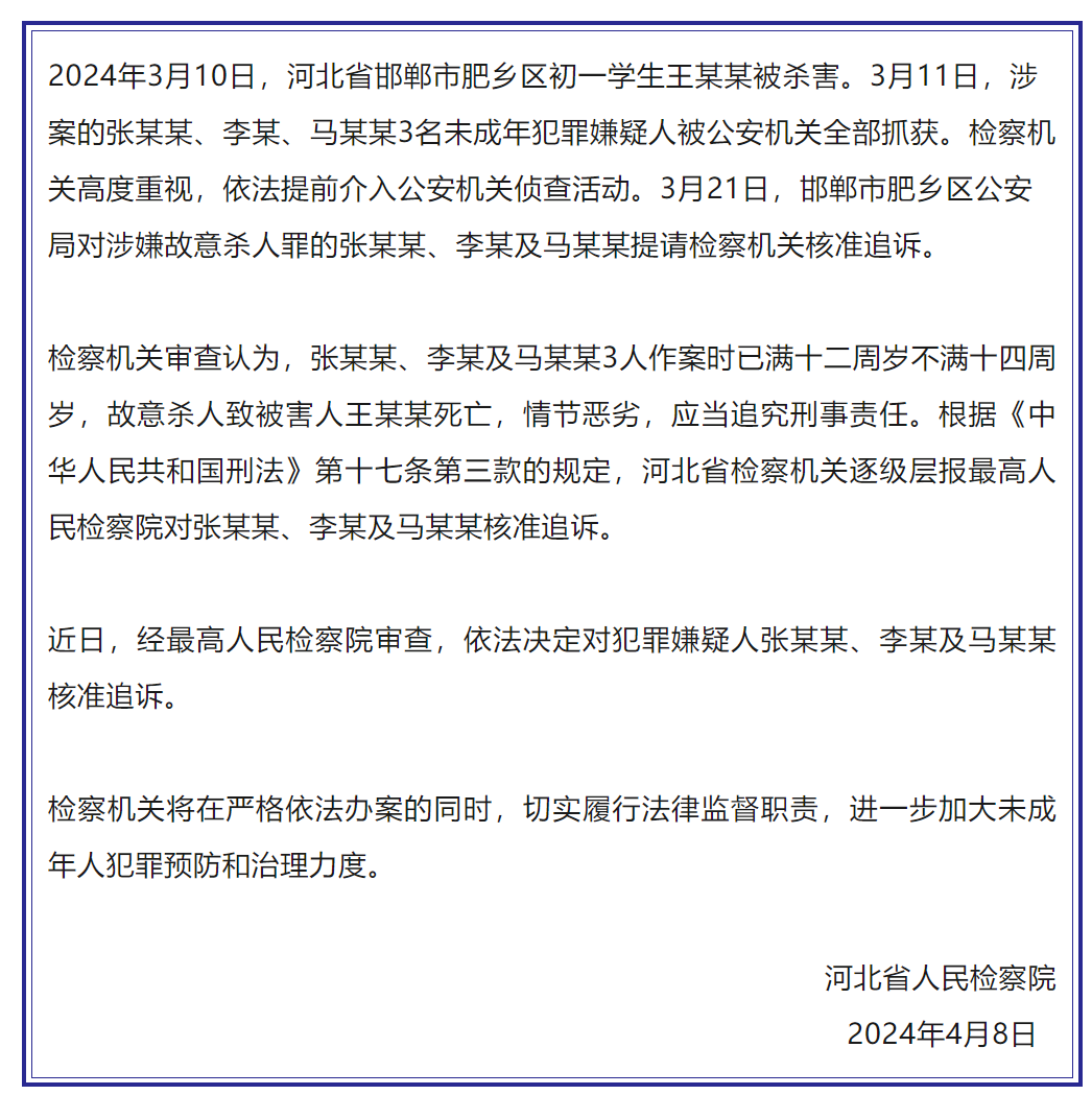 據河北省人民檢察院微信公眾號8日消息,2024年3月10日,河北省邯鄲市肥鄉區初一學生王某某被殺害。3月11日,涉案的張某某、李某、馬某某3名未成年犯罪嫌疑人被公安機關全部抓獲。檢察機關高度重視,依法提前介入公安機關偵查活動。3月21日,邯鄲市肥鄉區公安局對涉嫌故意殺人罪的張某某、李某及馬某某提請檢察機關核准追訴。