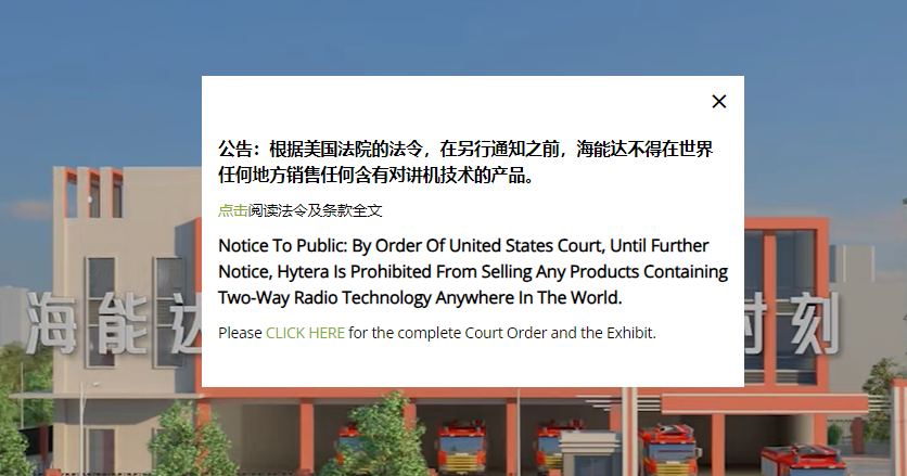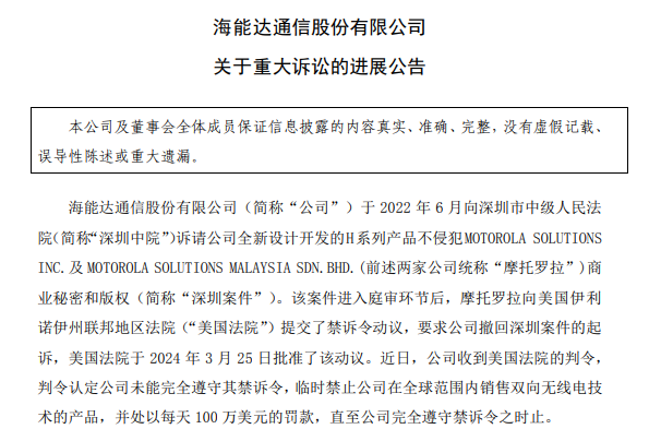 近日,海能達收到美國法院的判令,判令認定該公司未能完全遵守其禁訴令,臨時禁止海能達在全球範圍內銷售雙向無線電技術的產品,並處以每天100萬美元的罰款,直至該公司完全遵守禁訴令之時止。
