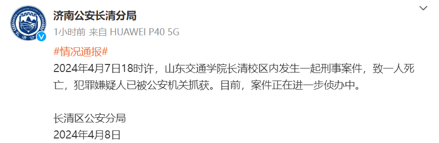 @濟南公安長清分局 8日通報,2024年4月7日18時許,山東交通學院長清校區內發生一起刑事案件,致一人死亡,犯罪嫌疑人已被公安機關抓獲。目前,案件正在進一步偵辦中。