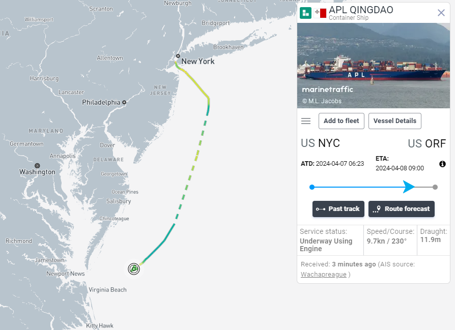 據紐約WCBS電視報道,經搶修,“Qingdao”號已恢復動力,7日早晨重新駛出港口。舶航位置實時追蹤網站 MarineTraffic 顯示,截至北京時間8日中午,“Qingdao”號正在駛向下一目的地諾福克港。