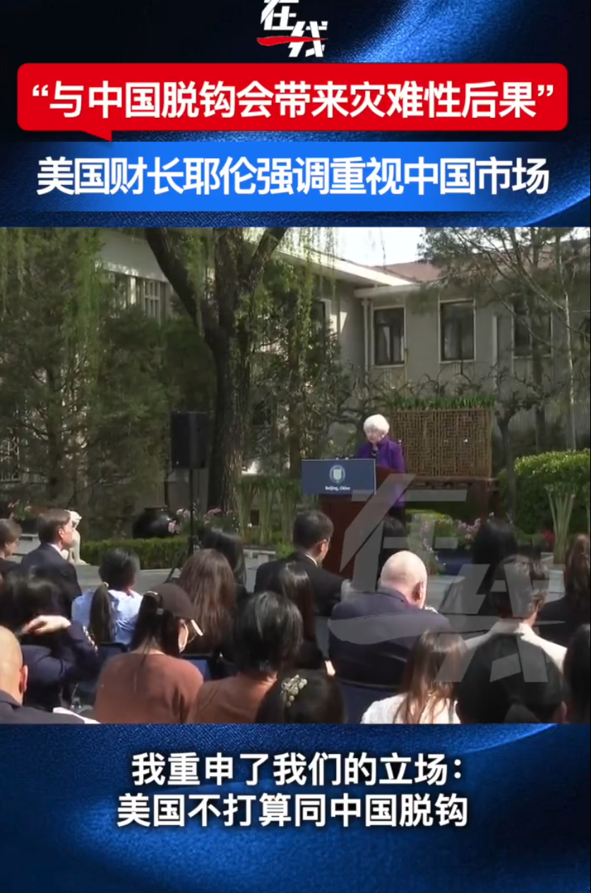 耶倫重申:不與中國脱鈎,脱鈎會帶來災難性後果 guancha 2024-04-08 歷經5天訪華行程後,美國財長耶倫在4月8日下午於北京舉行發佈會,她再次表示:不尋求與中國脱鈎,中美兩國經濟聯繫密切,脱鈎會帶來災難性後果。 (CGTN記者董雪 李明)
