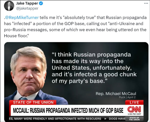 (觀察者網訊)綜合美國有線電視新聞網(CNN)和《國會山報》網站報道,當地時間4月7日,美國眾議院情報委員會主席、俄亥俄州共和黨籍議員邁克·特納(Mike Turner)在CNN節目中稱,俄羅斯的政治宣傳“絕對”已經滲透了美國共和黨,甚至他在眾議院都能聽見所謂“反烏克蘭”和“親俄羅斯”的信息。