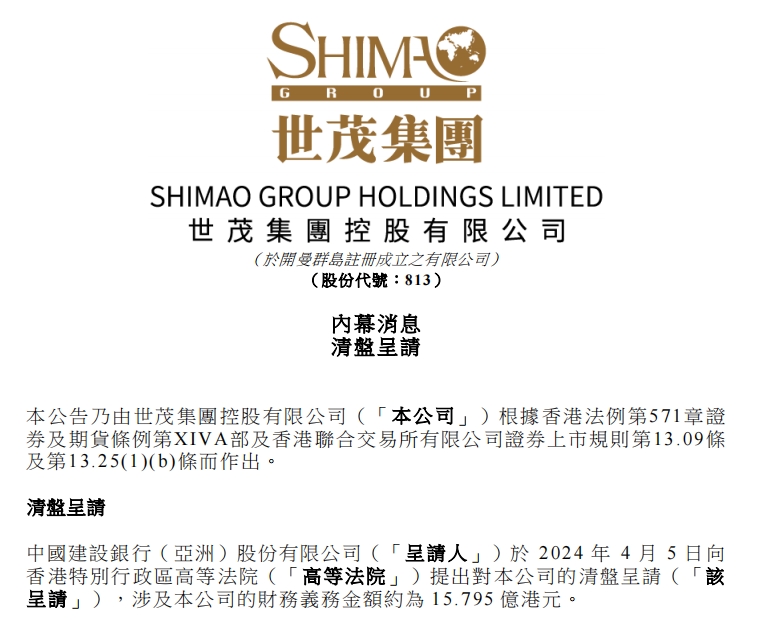 世茂集團星期一在香港交易所發佈公告,中國建設銀行(亞洲)股份有限公司於4月5日向香港特別行政區高等法院提出對公司的清盤呈請,涉及公司的財務義務金額約為15.795億港元(約2.72億新元)。