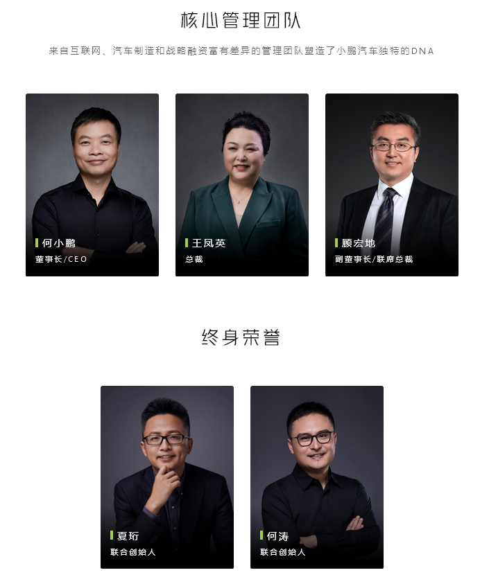 目前,小鵬的核心管理團隊僅有三人,分別為創始人、董事長兼CEO何小鵬,總裁王鳳英,以及副董事長、聯席總裁顧宏地。