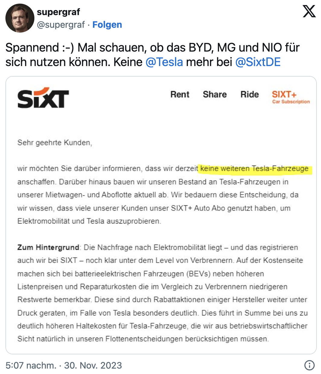 Sixt稱,特斯拉高昂的維修費用以及保值率不理想,成為其被拋棄的重要原因。該公司還補充表示,特斯拉車型留下的缺口,將通過寶馬、奔馳、奧迪以及比亞迪的電動車型予以彌補。