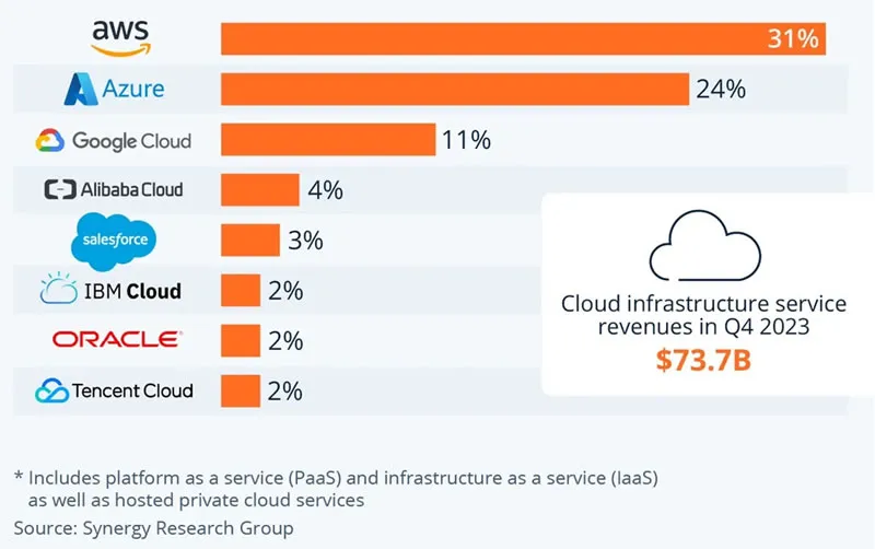 市場調研機構Synergy的數據顯示,2023年四季度,亞馬遜仍以31%的份額位居全球雲計算市場(PaaS+IaaS)榜首;微軟受與OpenAI合作的助推,份額環比增長2個百分點至25%;谷歌的份額穩定在11%左右。這三家美國公司的市場佔比合計高達67%,而阿里雲只有4%。