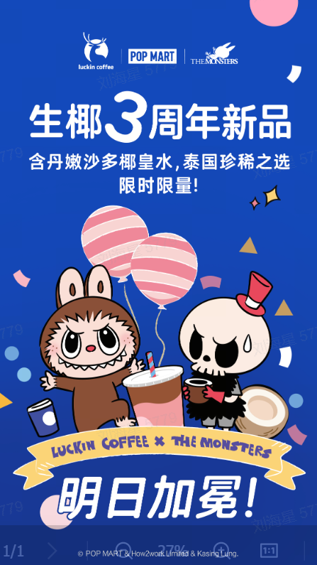 日前,中國咖啡行業領軍品牌瑞幸咖啡聯名潮玩領軍企業泡泡瑪特旗下IP——THE MONSTERS(精靈天團),共同推出生椰3週年新品椰皇拿鐵,備受粉絲們喜愛的LABUBU 的身影將出現在瑞幸線下聯名主題門店和咖啡包裝上,為消費者帶來視覺和味蕾雙重快樂衝擊的美妙體驗。