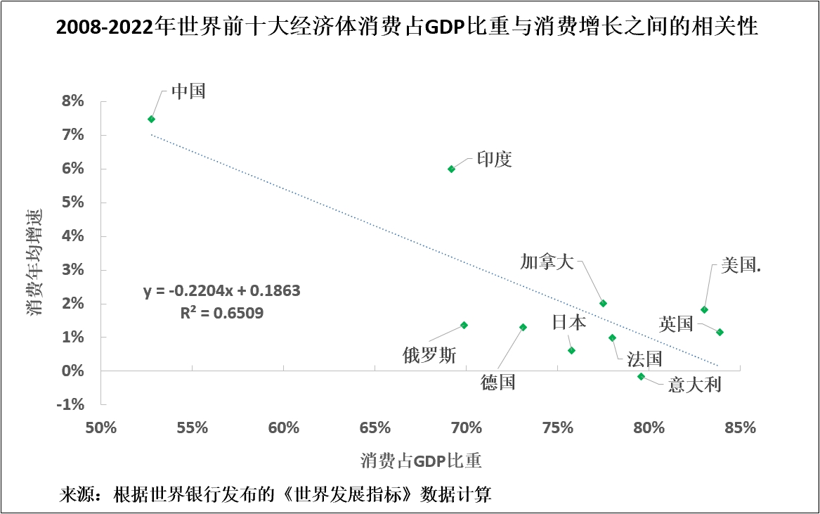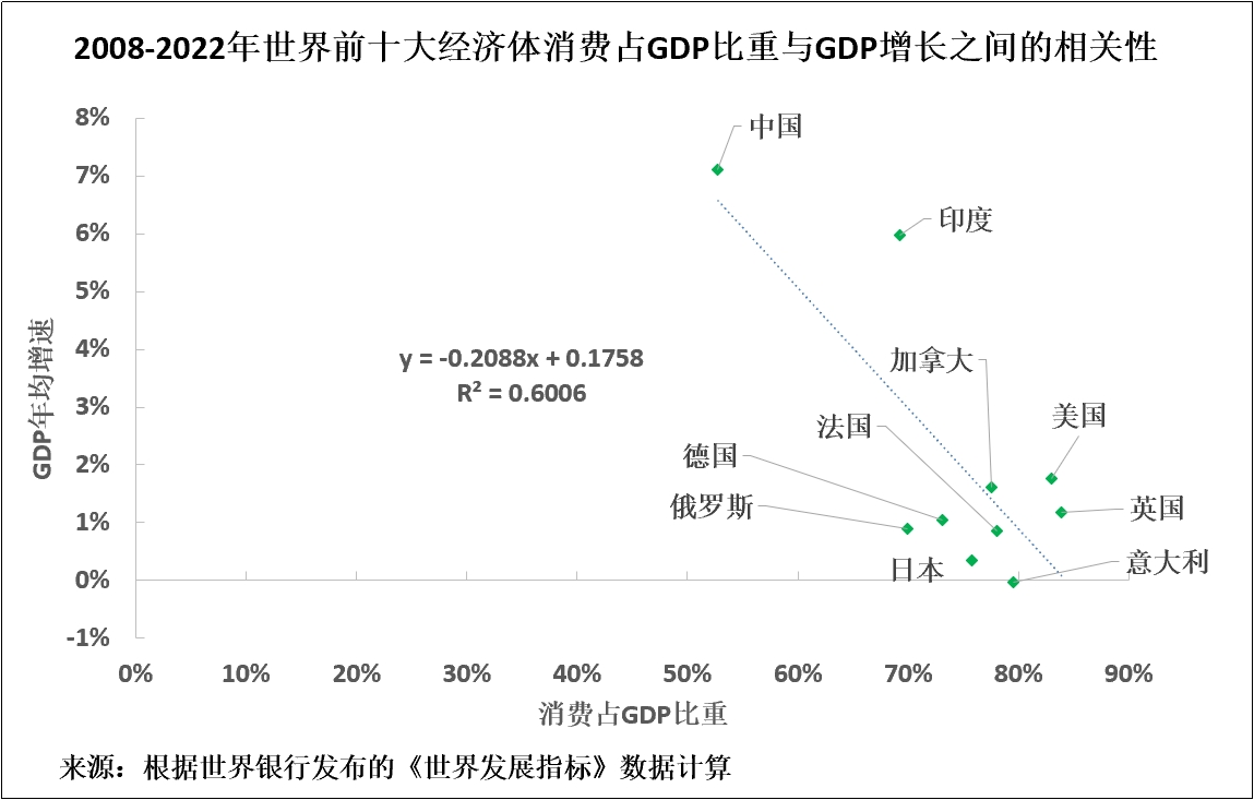 中國呈現出與其他大型經濟體一致的發展模式。也就是説,消費佔GDP比重與消費增長率之間存在極強的負相關關係。消費佔GDP比重越高,消費增長速度就越慢,投資佔GDP比重越高,消費增長速度就越快。