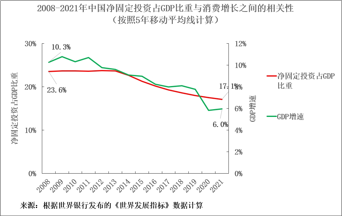 上文的圖3顯示,消費佔GDP比重與消費增長之間存在負相關性。因此,消費佔GDP比重下降消費增長率反而會有更快的增長。相比之下,圖14反映了淨固定投資佔GDP比重與消費增長率之間存在正相關性。從這種正相關性可以看出,淨固定投資佔GDP比重增加樂,消費同樣會有增長。但遺憾的是,以能消除短期經濟週期波動影響的5年移動平均線計算,從2008年國際金融危機到2021年(目前能獲得的最近的數據),淨固定資產投資佔中國GDP比重從23.6%降至17.1%。正如上述高相關性所不可避免的那樣,同一時期消費增速從10.3%降至6.0%。