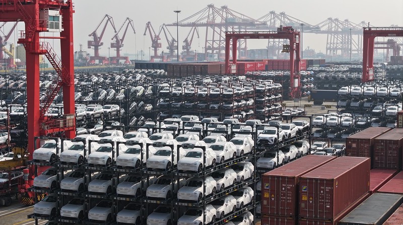 在太倉國際集裝箱碼頭等待出口的中國新能源汽車(圖片來源:ICphoto)