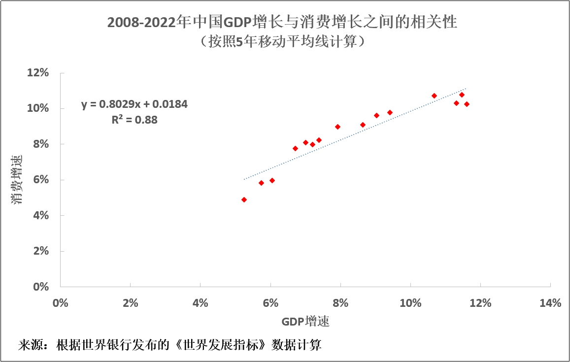 這意味着一個大型經濟體不可能在沒有高GDP增長率的情況下實現高消費增長率。