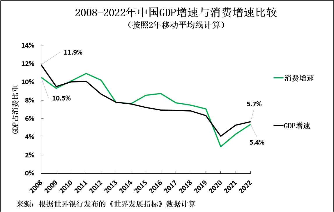如圖11所示,2008—2022年,中國消費佔GDP比重從50.4%升至53.5%,僅增長3.1%,但GDP增速從11.9%降至5.7%。