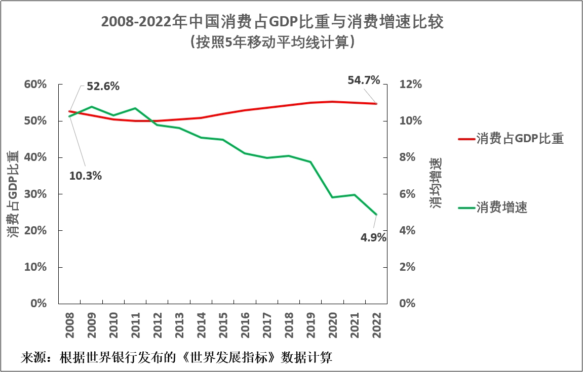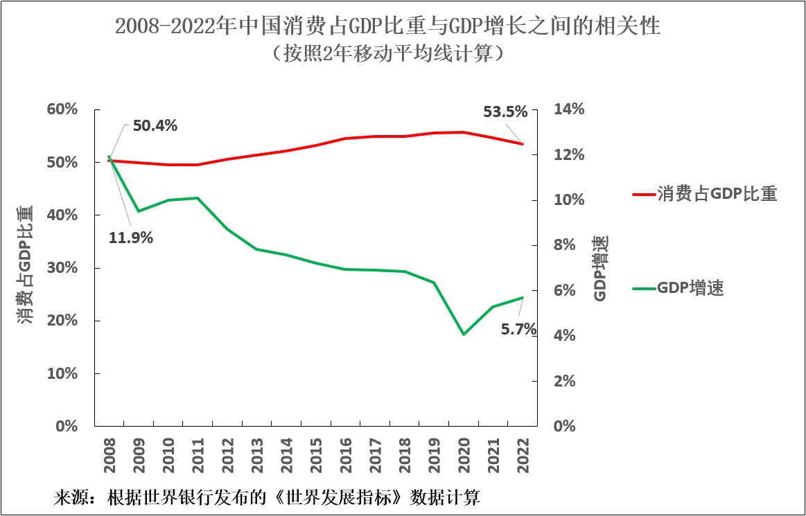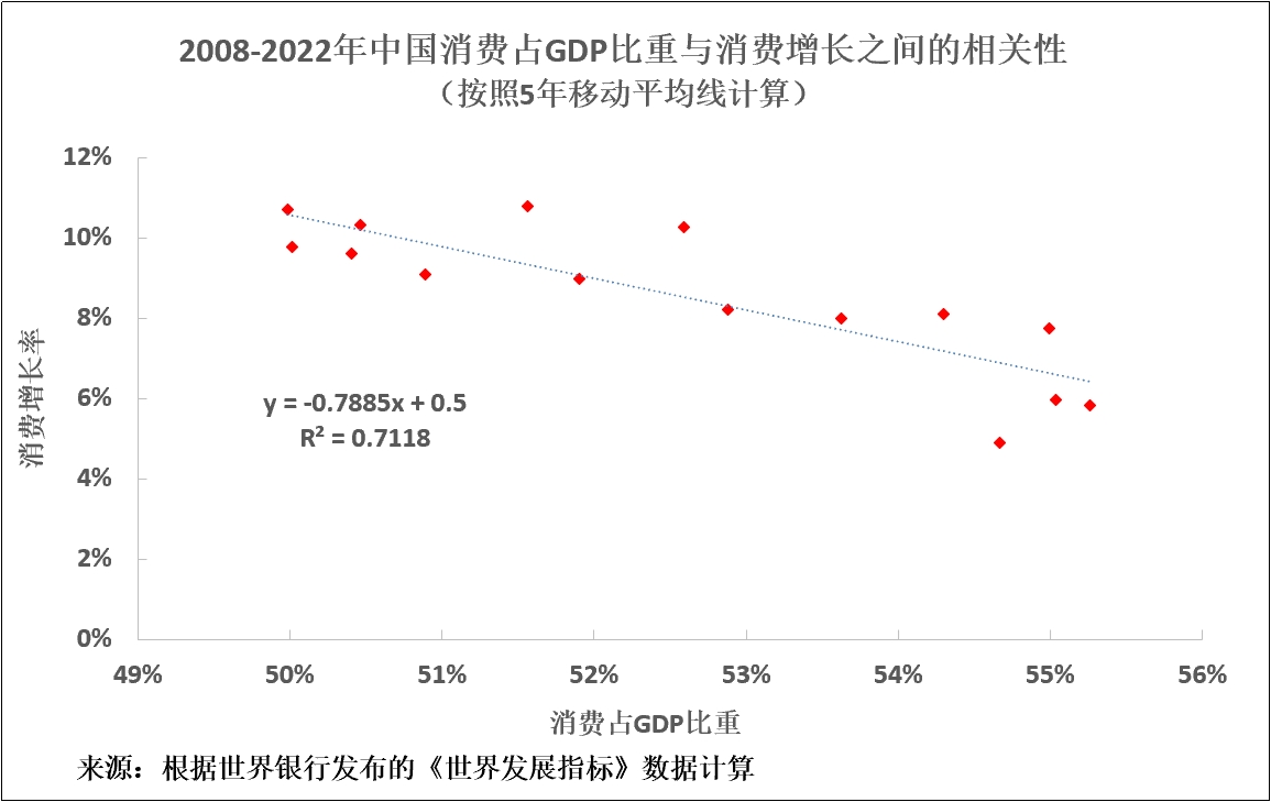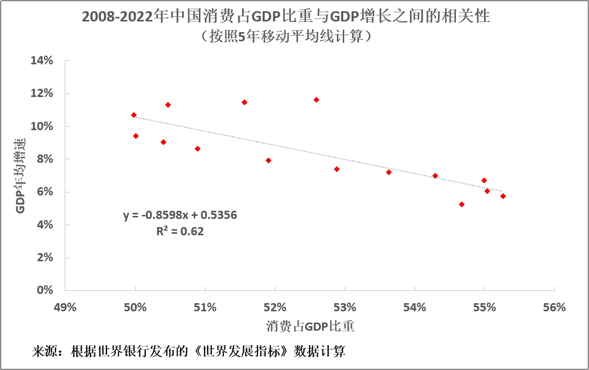 1,中國消費佔GDP比重從2008年的49.8%升至2022年的53%,上升了3.2%。這本身就會減緩中國消費增速,因為消費佔GDP比重與消費增長率之間存在負相關性。