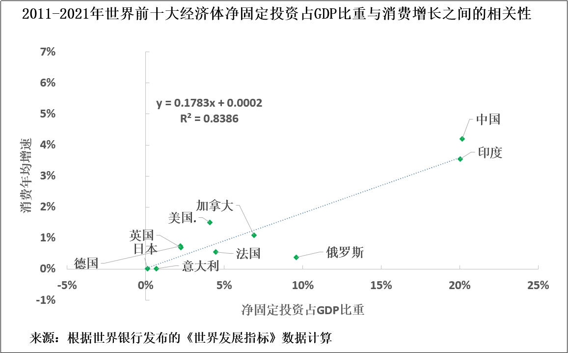 淨固定投資佔GDP中比重與消費增長率之間存在正相關性,不僅適用於中國,也適用於所有大型經濟體。因此,與所有大型經濟體一樣,中國經濟也不可能違背這樣的規律。