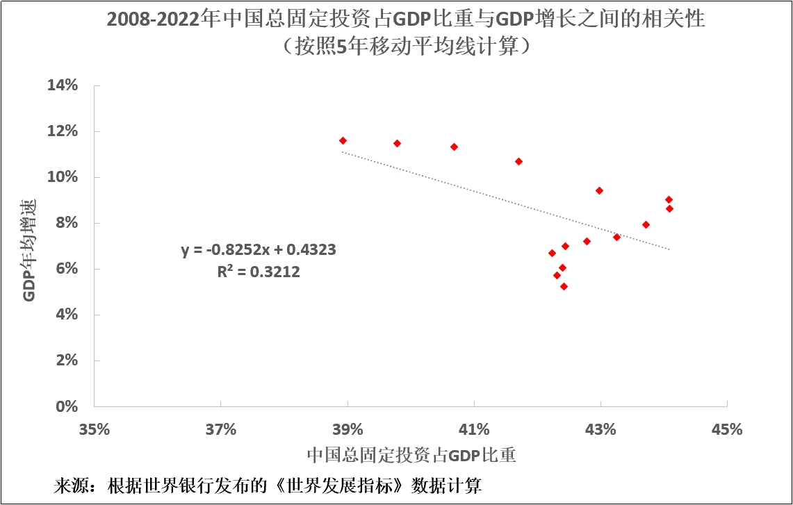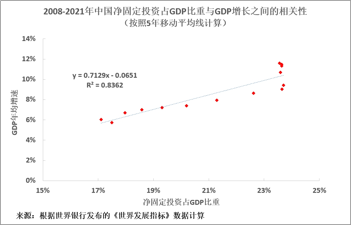 這種關係意味着,如果沒有高水平的淨固定投資,中國的GDP就無法快速增長。它還表明,淨固定投資佔GDP比重提高將伴隨着GDP增速提高,反之亦然。