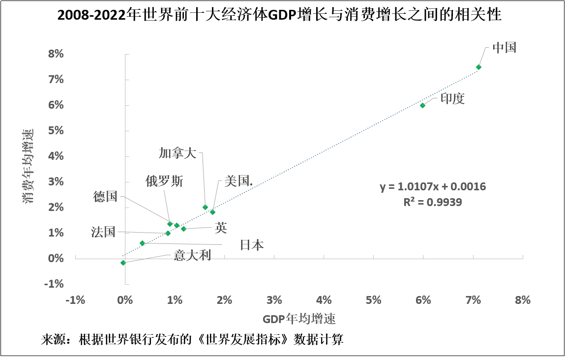 原因是大型經濟體的GDP增長率與消費增長率之間存在極強的相關性。也就是説,如果GDP不能高速增長,那麼消費和生活水平就不能高速增長。