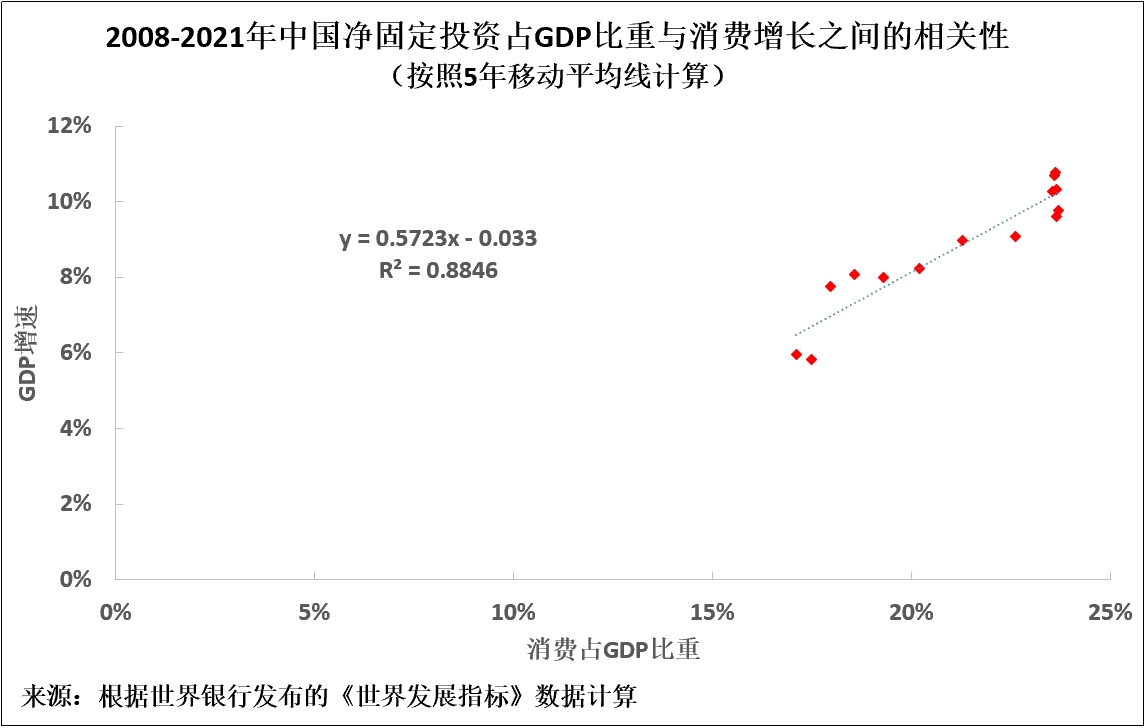 無論是馬克思主義經濟學還是嚴謹的西方經濟學都非常清楚,消費不是生產投入。因此,兩者均預測,如果通過提高消費佔GDP比重降低投資佔GDP比重,那麼GDP增速就會下降。由於GDP增長和消費之間存在密切的相關性,因此兩者都預測,隨着消費佔GDP比重上升,投資水平必然下降,GDP增長率亦將下降。