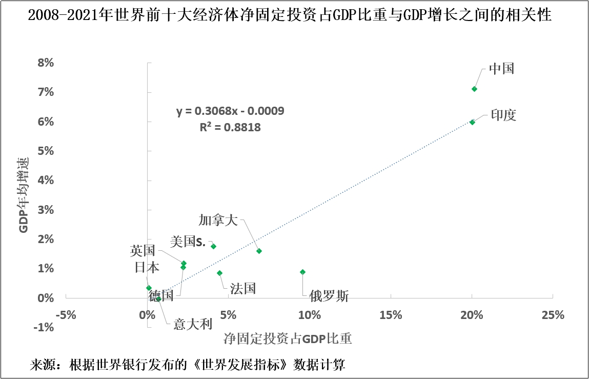 讓我們再次從國際比較開始分析。從2008年國際金融危機到2021年,大型經濟體的淨固定投資佔GDP比重與GDP年均增速之間存在極強的相關性,為0.94,R平方關係為0.88(見圖7)。