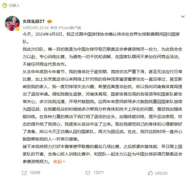 4月8日晚,朱婷通過個人微博宣佈將會在世界女排聯賽期間迴歸國家隊,並稱此次歸隊的唯一目的就是為中國女排奪取巴黎奧運會參賽資格盡一份力。此外,她透露道,自己此前曾申請過退役。