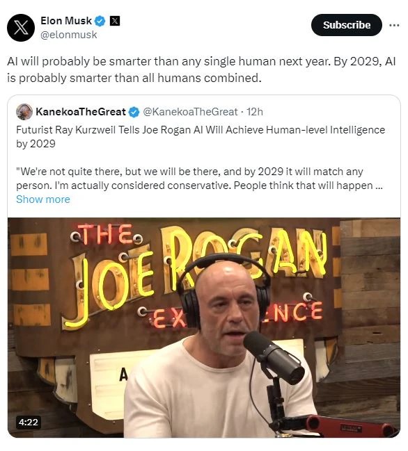 這已經不是第一次馬斯克對於生成式人工智能路線如此看好了。早在3月,馬斯克轉發著名未來學家雷·庫茲韋爾和播客喬·羅根的一次討論時就表示過類似觀點。而在去年,馬斯克曾在另一檔節目中表示,能力完全的通用人工智能將在2029年前實現。
