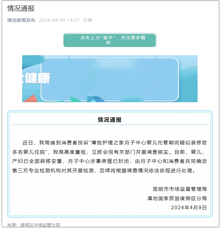 近日,我局接到消費者投訴“博悦護理之家月子中心嬰兒託管期間疑似裝修致多名嬰兒住院”,我局高度重視,立即會同有關部門開展調查核實。目前,嬰兒、產婦已全部轉移安置,月子中心涉事房屋已封閉,由月子中心和消費者共同確定第三方專業檢測機構對其開展檢測,後續將根據調查情況依法依規進行處理。